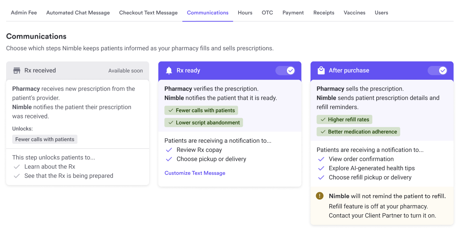 - The "Refill" Warning: If you turn Communications ON but "Refills" is OFF, the system will show a warning icon. This means you're telling patients to get a refill, but your system isn't set up to actually process them.